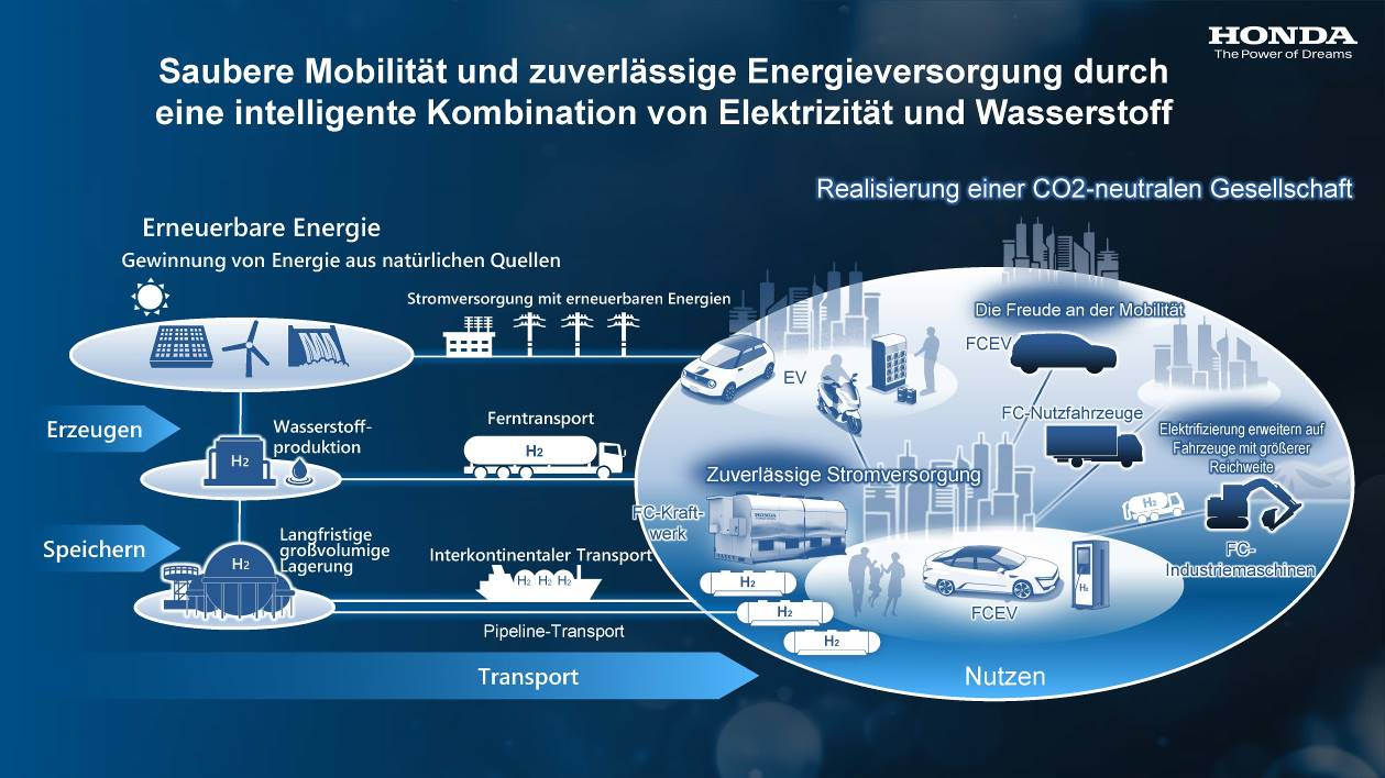 Honda strebt bis 2050 eine Klimaneutralität für alle Produkte und Geschäftstätigkeiten an, an denen es beteiligt ist. Hierbei sollen nicht nur die Umweltauswirkungen aller Produkte auf Null reduziert werden, sondern auch die des gesamten Lebenszyklus einschließlich der Geschäftstätigkeiten des Unternehmens. Honda konzentriert sich dabei auf folgende "drei Säulen" seiner Initiativen: "CO2-Neutralität", "saubere Energie" und "Ressourcenkreislauf". Wasserstoff ist neben Elektrizität einer der Energieträger mit großem Potenzial.